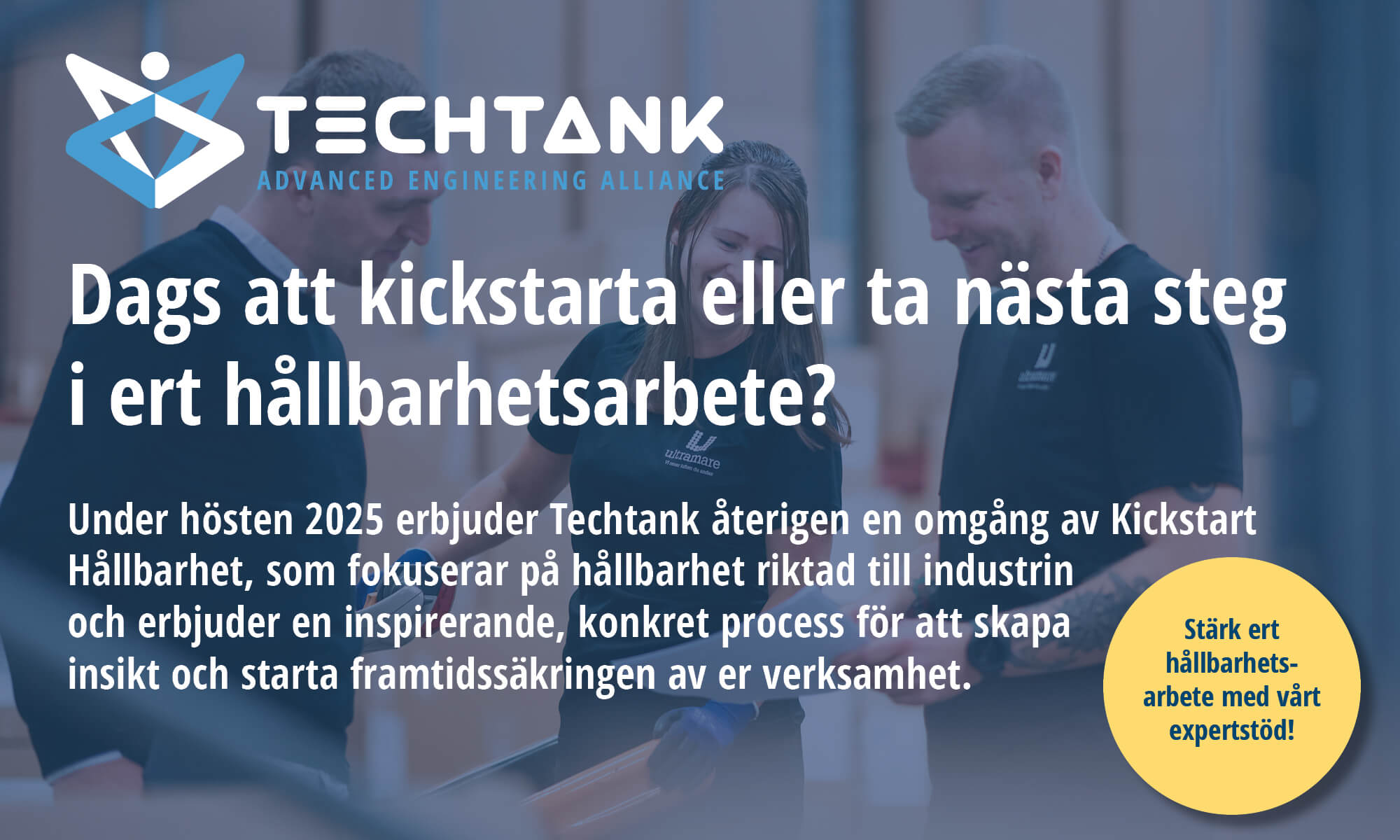 Under hösten 2025 erbjuder Techtank återigen en omgång av Kickstart Hållbarhet, som fokuserar på hållbarhet riktad till industrin och erbjuder en inspirerande, konkret process för att skapa insikt och starta framtidssäkringen av er verksamhet.