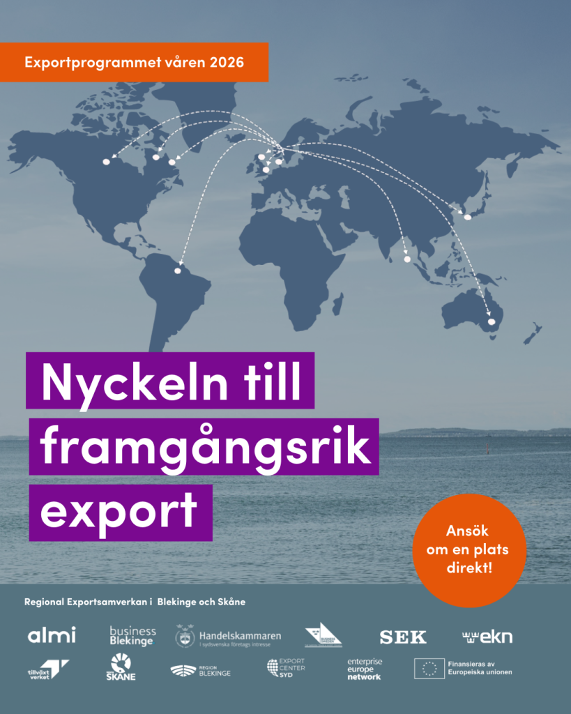 Vill ditt företag ta steget ut på internationella marknader? Under våren 2026 arrangeras Exportprogrammet – ett kostnadsfritt program för små och medelstora företag i Blekinge och nordöstra Skåne som vill börja exportera eller utveckla sin internationella satsning.