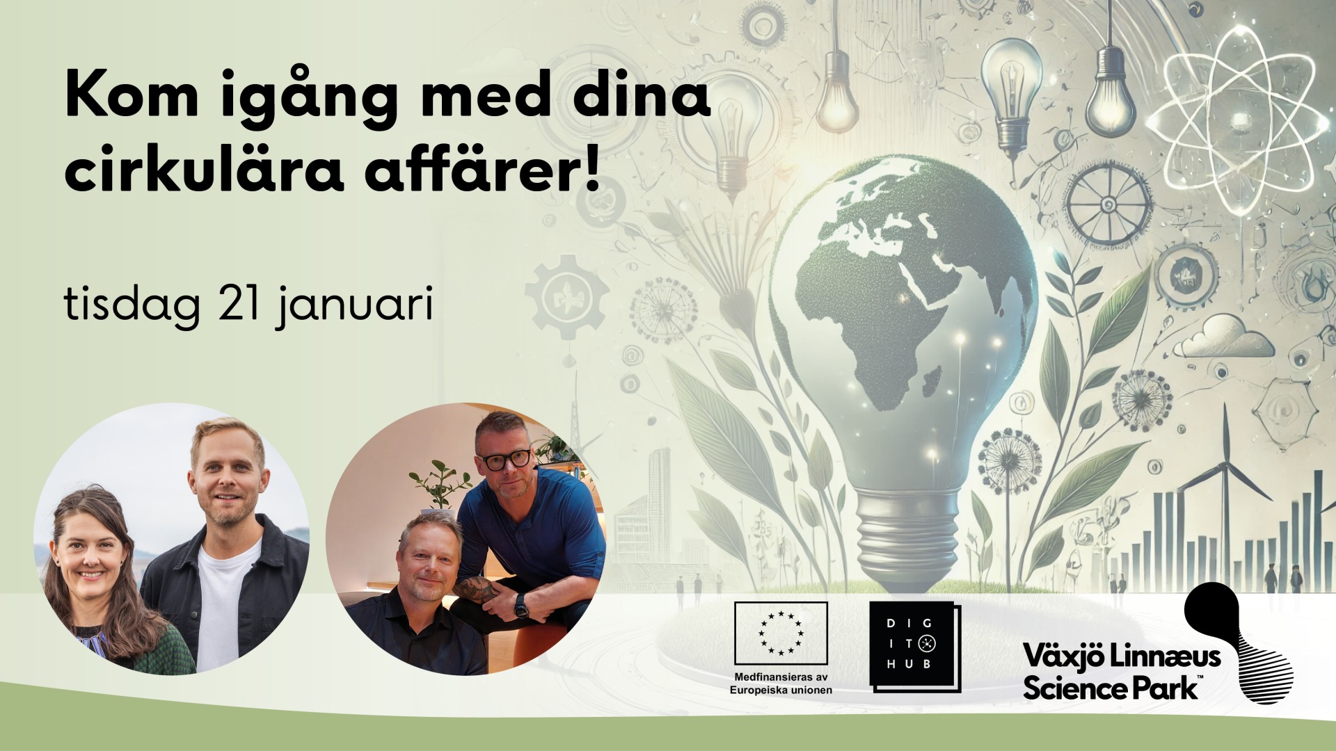 Taina Flink på Xvii har en bakgrund som civilingenjör i teknisk design och är expert inom affärsutveckling och resurseffektivisering för hållbar och cirkulär innovation av produkter och tjänster. Jesper Gunnarsson på Xvii har stor erfarenhet från att utveckla,testa och implementera cirkulära affärsmodeller. Han har jobbat länge med att validera antaganden och minska osäkerheter. Pontus Albinzon och Stefanos Papamichailidis från Almi Kronoberg delar insikter och möjligheter från projektetom projektet Cirkulära Affärsmodeller – en möjlighet för små och medelstora företag i Kronoberg att anpassa sig till nya hållbarhetskrav och samtidigt stärka sin konkurrenskraft Eventet har begränsat antal platser och arrangeras som en del i DigIT Hub ett initiativ med stöd från EU. Det är kostnadsfritt för er som företag men ni behöver signera ett intyg om försumbart stöd (De minimis). För frågor och mer information, kontakta elina.landqvist@vaxjo.se