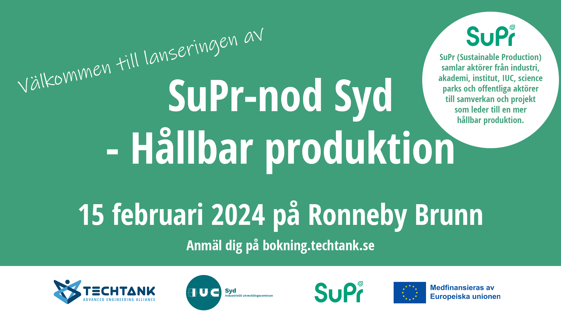 SuPr (Sustainable Production) är en nationell nod för hållbar produktion. Techtank i Blekinge och IUC Syd i Skåne utgör tillsammans en ny verksamhetsnod för SuPr i södra Sverige och den 15 februari är det dags för lanseringskonferens för SuPr-nod Syd. Vi välkomnar industri- och teknikföretag från södra Sverige för att höra mer om vilket stöd ni kan få via noden. Under förmiddagen får vi även lära oss mer om bl a klimatdeklarationer, Green accelerator/Green Kaizen och olika begrepp att hålla reda på gällande hållbarhet. Vi får även lyssna till ett av Techtanks medlemsföretag, Roxtec, hur de arbetar med hållbarhet och klimatanpassning. Varmt välkommen med din anmälan!