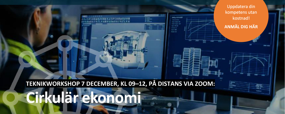 Den här Teknikworkshoppen riktar sig till dig som vill veta mer om hållbarhet och cirkulär ekonomi och hur ditt företag kan börja och/eller fortsätta resa mot mer cirkulära affärsmodeller och produkter som ger positiva effekter till den gröna omställningen. Under workshoppen arbetar vi aktivt med ett verktyg som hjälper dig att definiera cirkularitetsmål för ditt företag. Du får ökad förståelse för cirkulär ekonomi, dess olika områden och cirkulära strategier samt industriella exempel på företag som arbetar med cirkulär ekonomi. Du får också ökad kunskap om hur miljö och ekonomi positivt kan gagnas av cirkulär ekonomi.Workshopledare