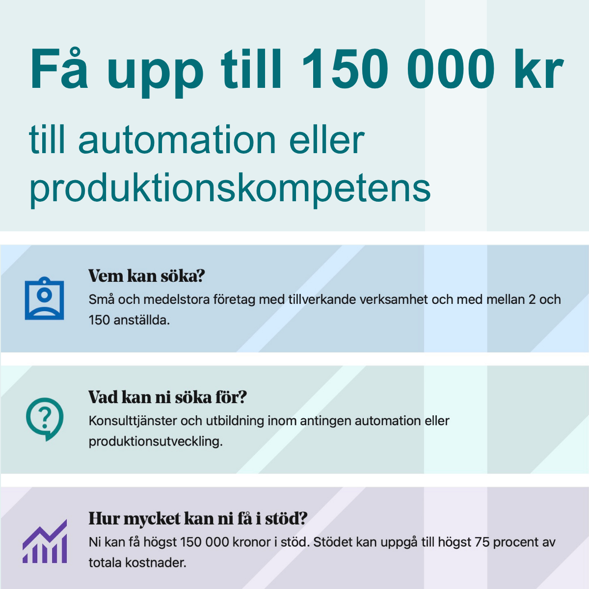 Är ni ett litet eller medelstort företag med tillverkande verksamhet som vill stärka er långsiktiga konkurrenskraft genom att utveckla er produktion? Nu erbjuder Tillväxtverket checkar till företag för satsningar på antingen automation eller produktionskompetens. Ansökan är öppen redan nu, sista ansökningsdag: 18 september 2026.