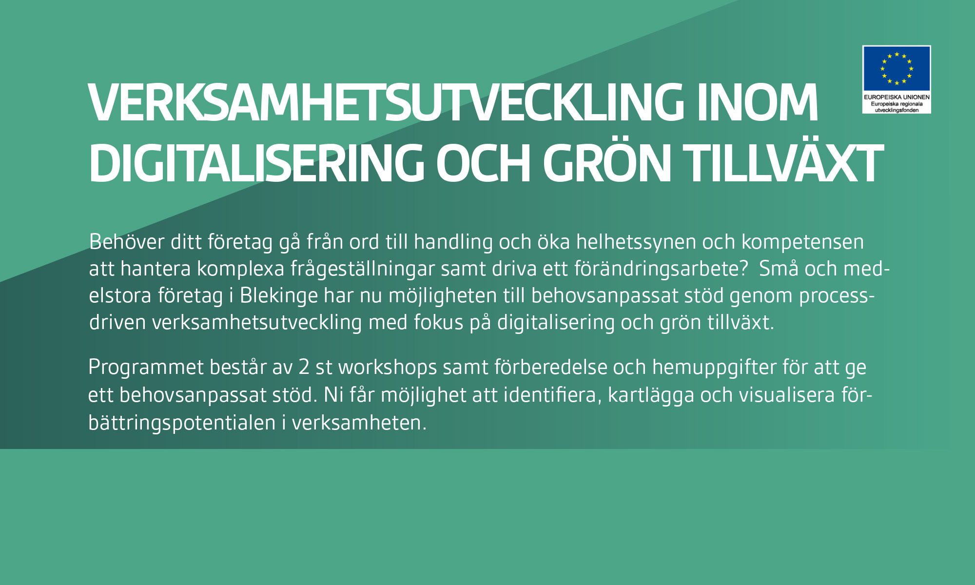 Behöver ditt företag gå från ord till handling och öka helhetssynen och kompetensen att hantera komplexa frågeställningar samt driva ett förändringsarbete? Små och medelstora företag i Blekinge har nu möjligheten till behovsanpassat stöd genom processdriven verksamhetsutveckling med fokus på digitalisering och grön tillväxt.